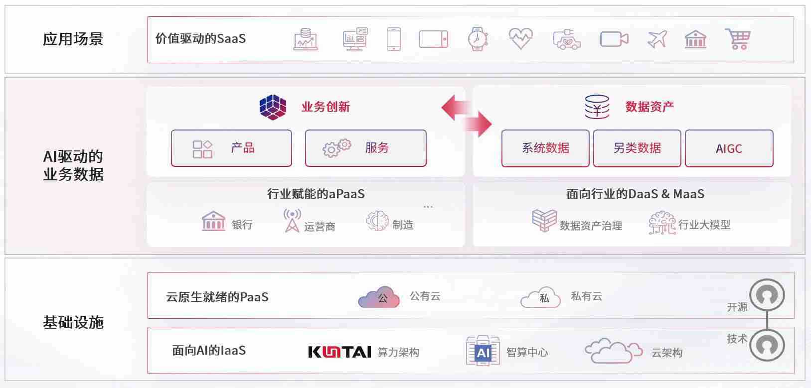 数字时代,,围绕企业数字化转型的关键要素,,,,AG尊龙凯时数码开创性的提出数云融合战略和技术体系框架,,着力在云原生、、、数字原生、、、、AI原生和信创产业上架构产品和服务能力,,,,为处在不同数字化转型阶段的快消零售、、汽车、、金融、、、医疗、、、政企、、、、教育、、、运营商等行业客户提供泛在的敏捷IT能力和融合的数据驱动能力,,,构建跨界融合创新的数字业务场景和新业务模式,,,助力企业级客户建立面向未来的核心能力和竞争优势,,,全面推动社会的数字化、、智能化转型升级。。。