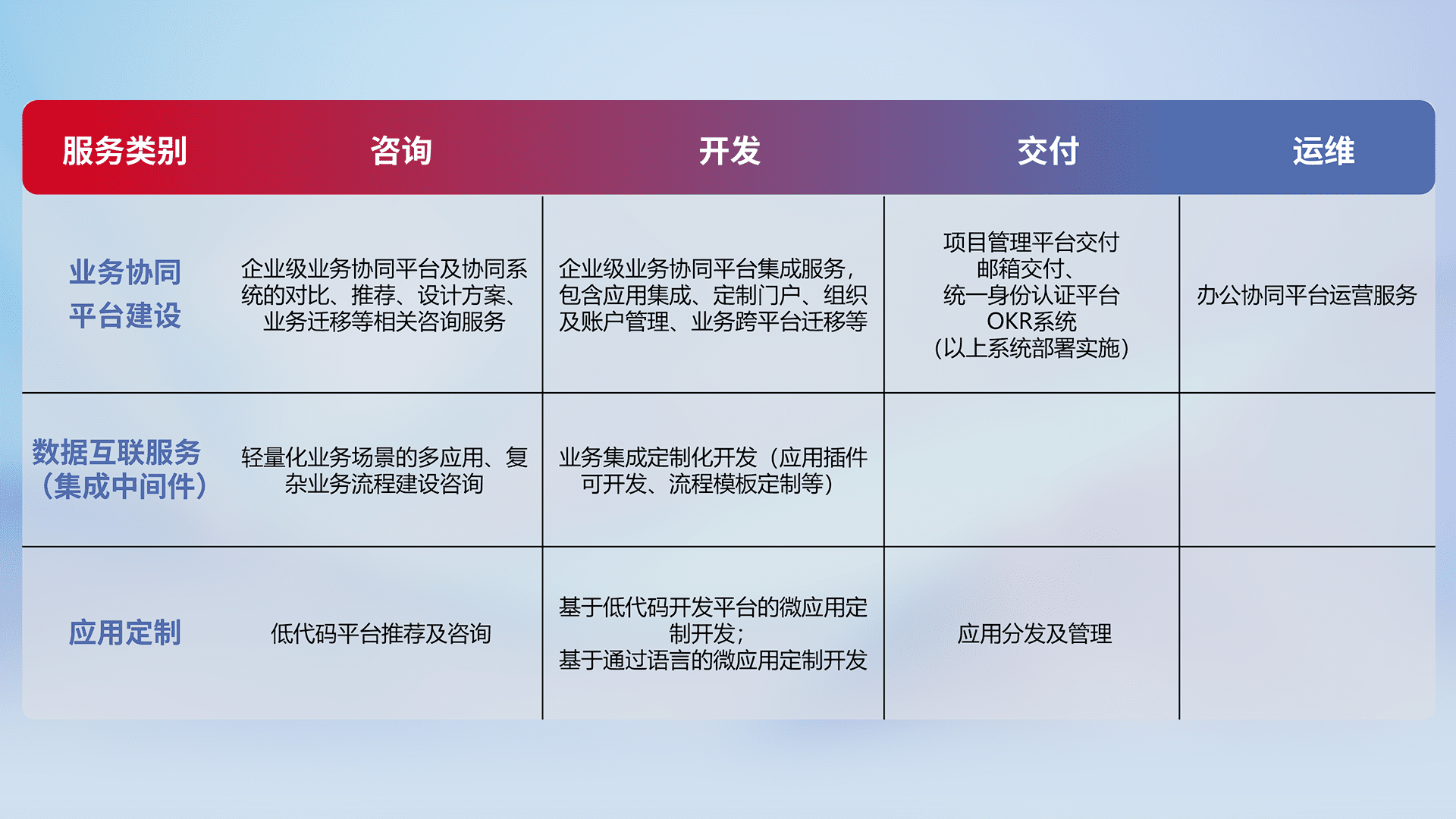 针对钉钉、、、、企微、、IDaas等平台级产品提供产品的规划、、、、方案、、交付、、、、定制化开发等服务,,,,实现如统一协同办公、、、智能客户服务、、混合会议管理、、、、智能数据查询、、、、等业务场景,,,,实现数字化转型。。。